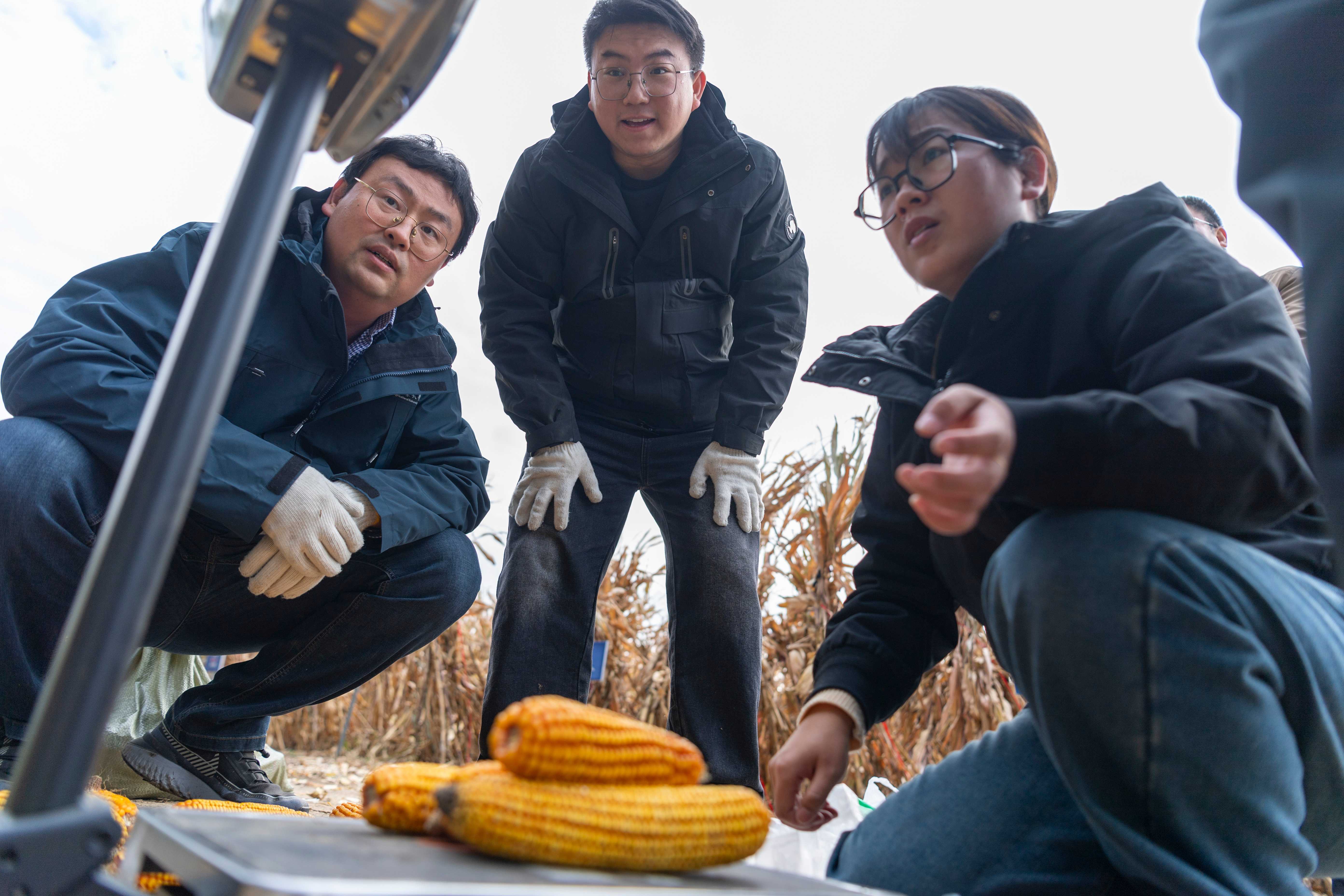 中国农业大学肇东实验站的科研人员在一片试验田边测量玉米产量 谢剑飞 摄