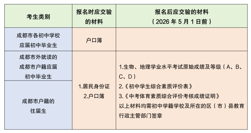 📌补报名:2026年3月13—16日,因各种原因错过正式报名的考生补报名。学籍、户籍不在同一招生区域的成都市户籍考生可修改之前选择的升学区域。3月13—23日,补报名考生完成《初中学生综合素质评价表》填报。